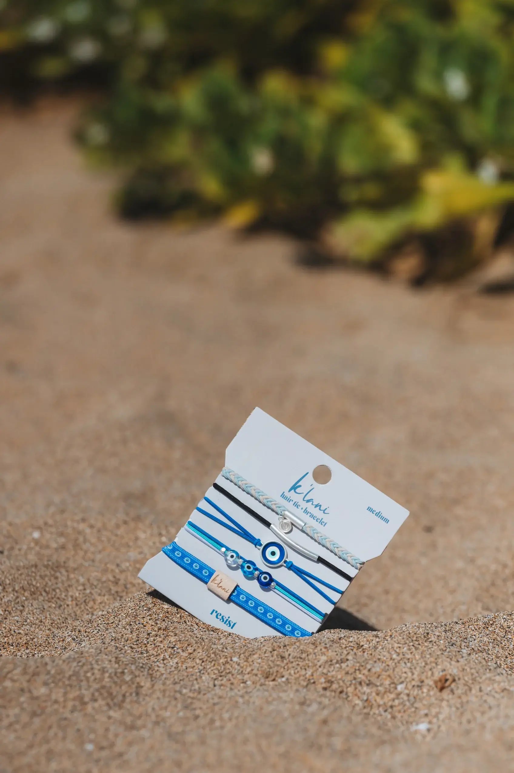 Our Resist Set includes 5 hair tie bracelets made of reflective blue colors and silver charms with the evil eye as the focal point. This set will help the wearer to resist the pull of envy and harmful intentions.